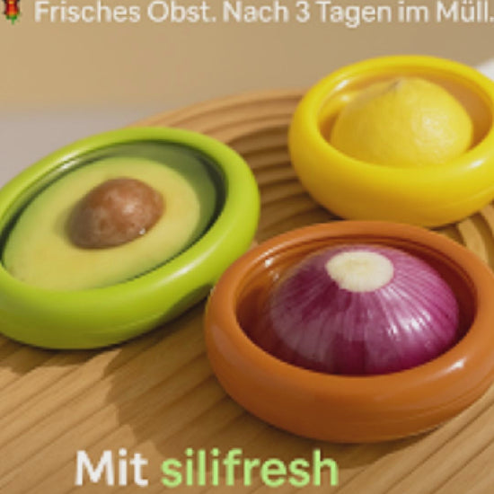 "Silifresh-Weniger Müll. Mehr Frische." Wiederverwendbarer Aufbewahrungsbehälter für Obst und Gemüse