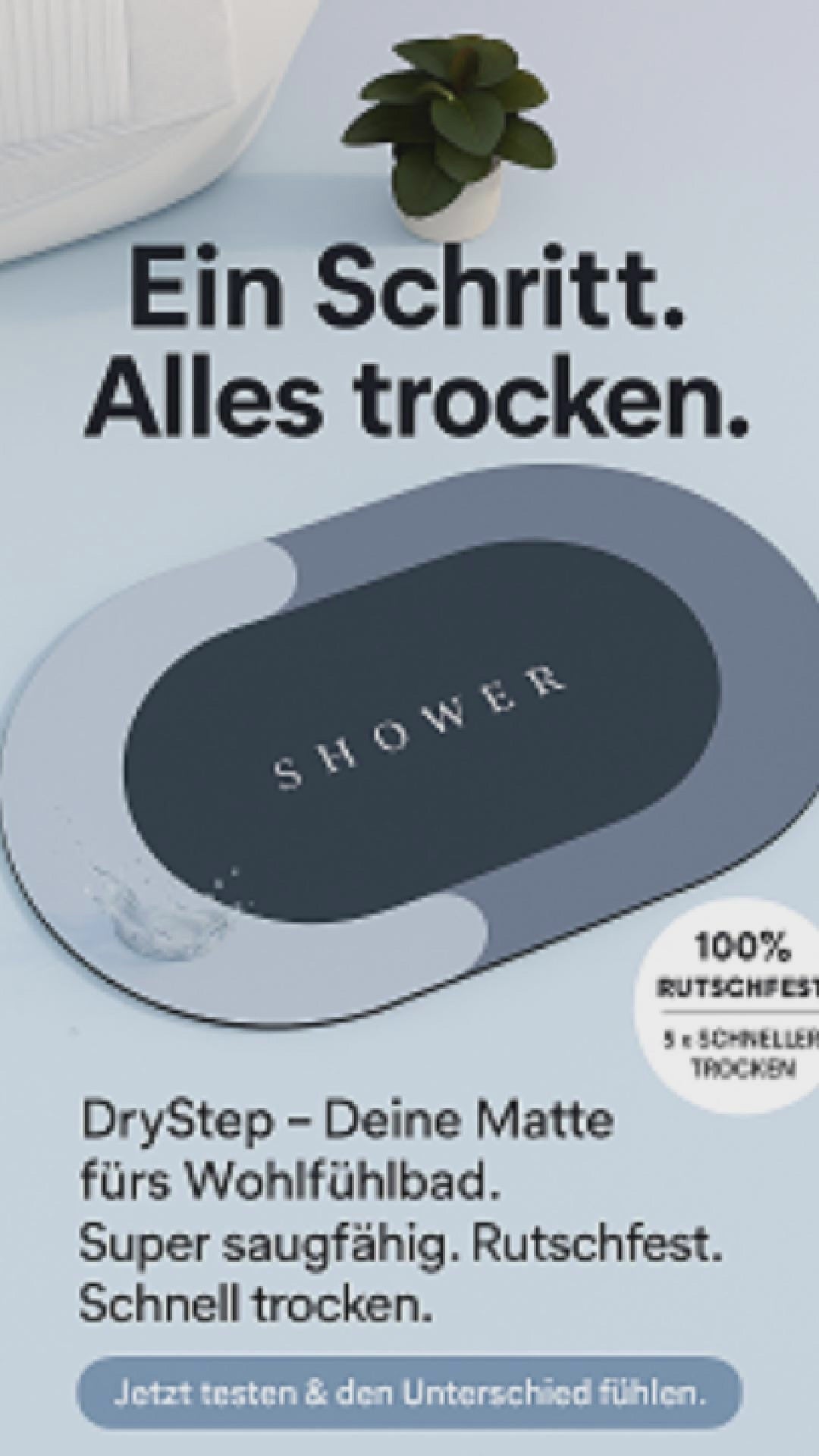 👉 Sag „Nein“ zu Pfützen und Rutschgefahr. Hol dir jetzt DryStep – Deine Matte fürs Wohlfühlbad und verwandle dein Bad in eine sichere Wohlfühloase!